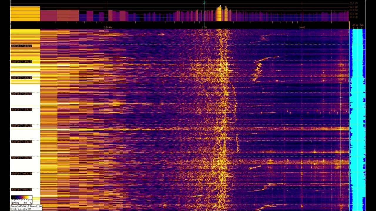 Геомагнитная активность обычно на частотах до 5 Гц и зависит от Солнечной активности. На более высоких частотах спектра могут присутствовать сигналы сверхдальней связи и др. Детали в этих плейлистах: EMF monitor https://youtube.com/playlist?list=PLiRg2YCbXcwn41BHqADKVBep_TgVq6XUN Очень Низкая Частота ~ Very Low Frequency https://youtube.com/playlist?list=PLiRg2YCbXcwnp5DxM4PnSs7k_Rnypaqek SIGNALS IN THE GROUND https://youtube.com/playlist?list=PLiRg2YCbXcwl6f3Bf5arHbGSOCNE5U71O поддержать канал: 8-999-654-93-44