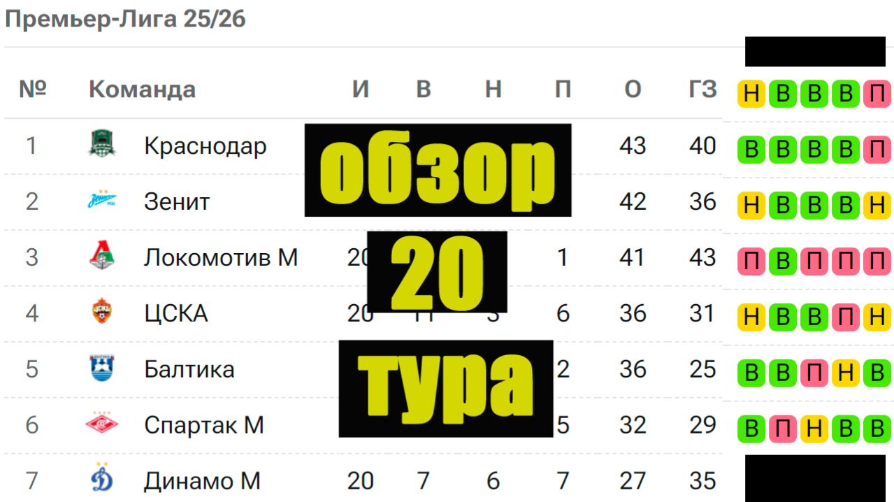 РПЛ 2025/26: Поражение Зенита и Краснодара. Обзор 20 тура. Результаты, таблица, расписание.
