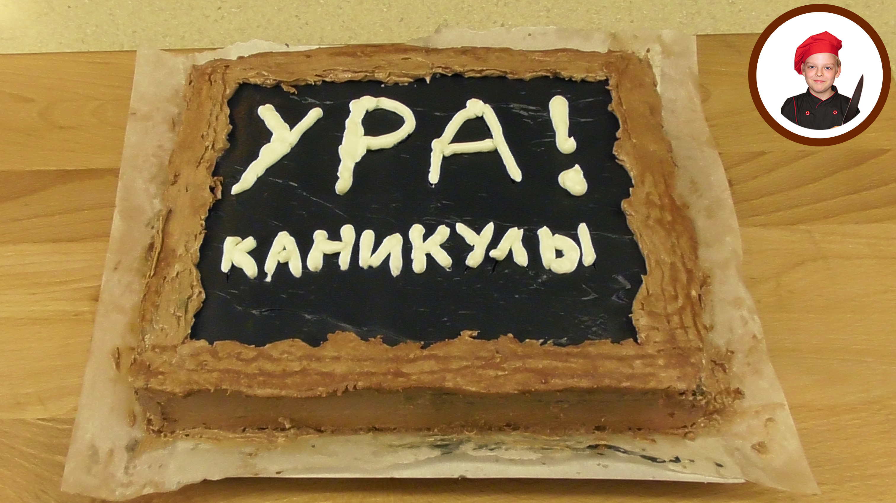 Торт "Наполеон" на окончание 4 класса, с радостной надписью "Ура каникулы". Ингредиенты: - Готовые коржи для торта "Наполеон" - Масло сливочное - 2 упаковки (340 г.) - Сахар - 200 г. - Пищевые краситель черный - Какао порошок - 1 столовая ложка - Вода - 50 г. #торт #рецепт #Апухтин #кулинария