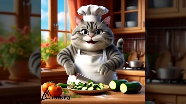 Весёлый котик показывает как готовить используя реальные рецепты. Qr code с полным рецептом приготовления в конце.