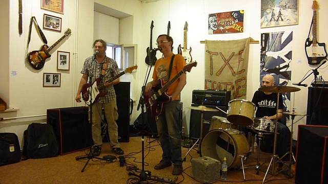 12 июля 2014. Выставка Первого национального музея рок-музыки "Let it be". Арт-центр "Пушкинская. 10". Встреча любителей ретро-гитар со старинными песнями и плясками в исполнении ансамблей "Грибы!", "OleUm tm" и "Pravednik's Band". "Грибы!"