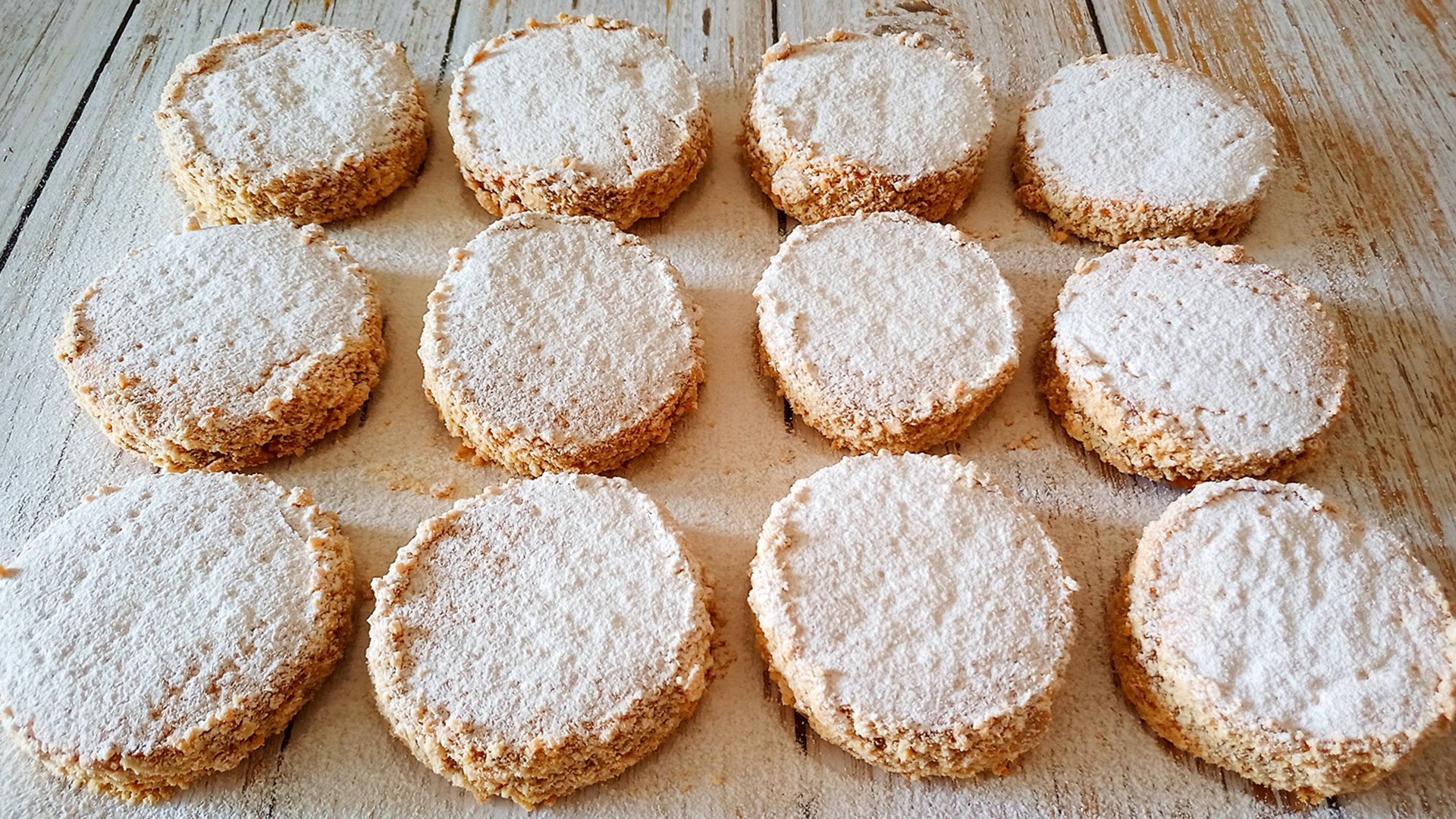 Аргентинское печенье: Тесто: 1. Сливочное масло – 200 г.; 2. Крахмал – 170 г.; 3. Мука – 300 г.; 4. Сахарная пудра – 100 г.; 5. Желтки – 4 шт.; 6. Разрыхлитель – 10 г.; 7. Коньяк – 30 г.; 8. Соль – ¼ tsp.; 9. Ванилин – ¼ tsp. Начинка: 1. Арахис – 70 г.; 2. Варёная сгущёнка – 300 г.; 3. Сахарная пудра. Общий выход изделий 12 шт., по 80 г. ___ Рекомендую мои блоги с рецептами: Блог на Яндекс Дзен: https://dzen.ru/sladkii_master Блог на mail ru: https://pulse.mail.ru/source/33903053... _ 💸Поддержите канал: 💳PayPal: dusiagrusha@gmail.com 💰 ЮMoney (Яндекс Деньги): 410015462997635 _ Мои авторские фотографии и ролики: https://www.pexels.com/ru-ru/@133115461/ ___ Рекомендации и особенности рецепта. *tsp – чайная ложка; *Сливочное масло мягкое; *Вместо сливочного масла, допускается маргарин (спред); *Крахмал кукурузный; *Для получения сахарной пудры, пробейте сахар в блендере или в кофемолке; *Желтки от яиц 65-70 г., (или категория – О); *Желтки охлаждённые; *Вместо конька можно использовать: водку, виски, ром; *Арахис желательно солёный; *Арахис предварительно размолоть скалкой или блендером в мелкую крошку; *Вместо арахиса подойдут любые, молотые орехи или семечки (тыквы, подсолнуха); Вся польза орехов и семян для ЖКТ и иммунитета человека: https://dzen.ru/media/sladkii_master/... *Варёная сгущёнка лучше распределяется по печенью, если она не холодная; *Вместо варёной сгущёнки можно использовать покупную или домашнюю карамель; *Вымешивать песочное тесто недолго, достаточно собрать его в шар; *При длительном вымешивании образуется клейковина и тесто получается не такое рассыпчатое; *Толщина раскатанного теста, составляет 0.5-0.8 см.; *Размер вырезных форм 6-8 см.; *Размер моей формы, составил 7.5 см.; *Выпекал в два приёма, на среднем уровне; *При наличии 2х противней, можно выпекать сразу всё печенье за один раз, при условии, что процесс выпекания, будет проходить в режиме конвекция; *Время выпекания может незначительно отличаться от заявленного в рецепте; *Время выпекания зависит от размеров песочных заготовок, особенностей продуктов и функциональности духовки; *После выпекания оставить на решётке до полного остывания; *Наносить варёную сгущёнку на остывшее печенье без сдавливания, т.к. оно очень нежное и может поломаться; *Хранить готовое печенье при комнатной температуре не более 7 суток или в холодильнике не более 30 дней; *Страна происхождения Аргентина.