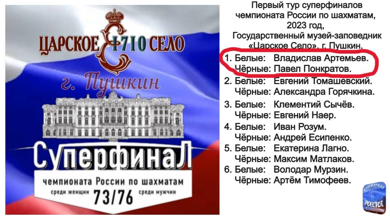 Чемпионат России 2023 год, 1 тур (белые - Владислав Артемьев, чёрные - Павел Понкратов).