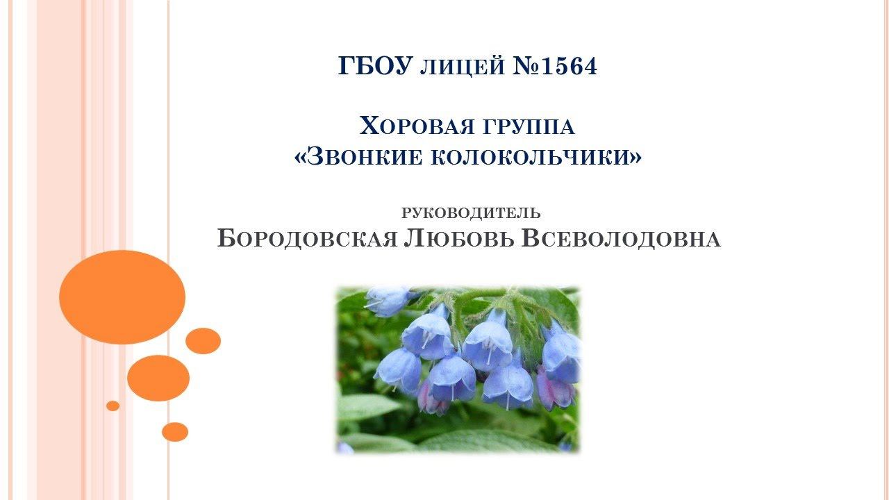 Хоровая группа«Звонкие колокольчики» руководитель Бородовская Любовь Всеволодовна 1.Здравствуй, Родина моя! Музыка Ю. Чичкова, слова К. Ибряева 2.Золотая осень Музыка И. Якушева, слова З. Петровой
