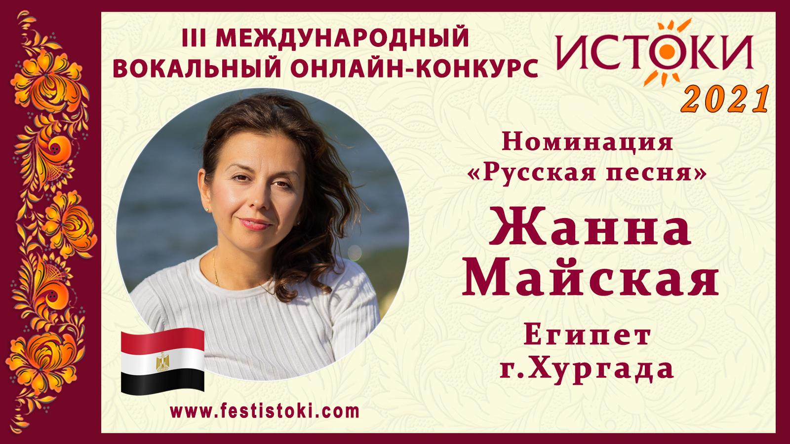 Дипломант III Международного вокального онлайн-конкурса «Истоки». Номинация "Русская песня". Песня "Любовь настала". Музыка Раймонд Паулс, слова Роберт Рождественский. Сайт: www.festistoki.ru / www.festistoki.com E-mail: festistoki@mail.ru