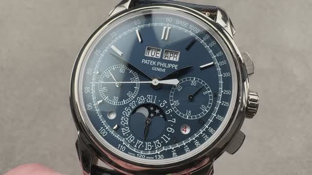 *перевести видео можно в Яндекс браузере Хронограф Patek Philippe Grand Complications с вечным календарем (5270G-014) выполнен из серого золота толщиной 41 мм и окружен синим циферблатом на темно-синем ремешке из кожи аллигатора с раскладывающейся пряжкой Calatrava Cross из серого золота. Этот хронограф Patek Philippe Grand Complications с вечным календарем оснащен такими функциями, как часы, минуты, малая секундная стрелка, дата, хронограф, день недели, месяц, фаза Луны и вечный календарь. Толщина этих часов Patek Philippe также составляет 12,8 мм, а расстояние от выступа до выступа составляет 49,4 мм. Для получения более подробной информации ознакомьтесь с полным обзором хронографа Patek Philippe Grand Complications Perpetual Calendar.