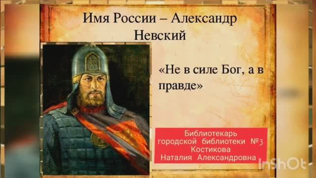 Библиотеки ЦБС города Сочи принимают участие в конкурсе лучших практик историко-патриотической работы муниципальных библиотек Краснодарского края «Высокой доблестью украшен и сердцем истинный герой…» с патриотическим историко-просветительским проектом «Ангел-хранитель земли Русской», посвящённым великому защитнику Руси, князю Александру Невскому, 800-летие со дня его рождения отмечается в 2021 году. Библиотекарь городской библиотеки № 3 города Сочи Костикова Наталия Александровна предлагает Вашему вниманию познавательный час, посвящённый князю Александру Невскому «Имя России — Александр Невский». Все права на использованные материалы сохраняются за правообладателями. 8 апреля 2021 года. http://library-sochi.ru/ #800лет_АлександрНевский #историяРуси #АлександрНевский #силуэтыистории #АлександрНевский800 #800летиеНевского_цбсСочи #ИсторияРоссии #литератураПобеды #гордимсяипомним #Безсрокадавности_цбсСочи #городскаябиблиотека3сочи #библиотеканаареде #культурадляшкольников_библ3Сочи #библиотекиСочивонлайнформате #культурадляшкольников_цбсСочи #культурадляшкольников2021 #читаемсудовольствием #КультураСочионлайн #читаемсинтересом #времячитать_цбсСочи #читаемдетям #читаемдома #культураРФ #культураСочи #Культура_Кубани #цбсСочи #библиотекиРоссии #детскиебиблиотекиСочи #библиотекиСочи #Библиотеки_Кубани #читатьмодно #чтопочитать #книголюб #времячитать #читаем #стихи #книга #читайипомни #мыслужимкниге #библиотекивонлайнформате_цбсСочи