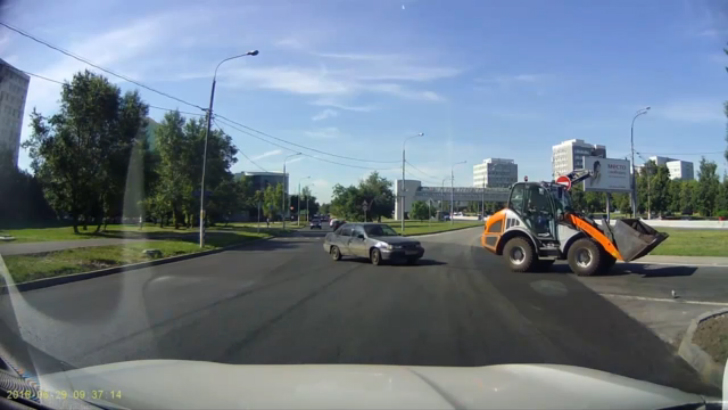 Водитель Нексии решил не пропускать фронтальный погрузчик, водитель которого продемонстировал чудеса маневренности и избежал серьезных повреждений.