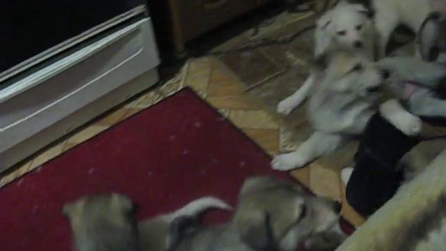 На ролике щенки питомника С Туруханского края из трёх разных помётов - от трёх разных сук которых приходилось содержать дома до самой вакцинации или до продажи так как в тот период очень много было собачьих болезней , а возможности содержать щенков в другом месте не было. Потому приходилось выходить из положения таким образом - содержать в отгороженном месте кухни.