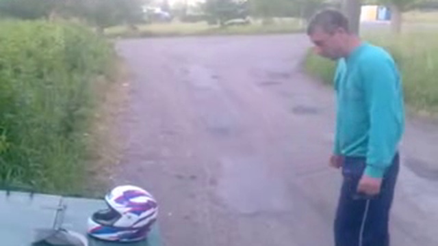 Русский быдлос пробивает головой мотоцыклетный шлем