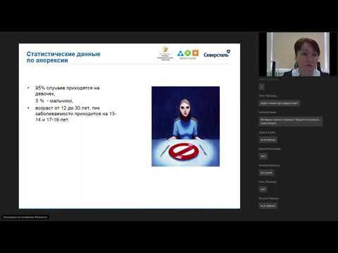 Ведущий - Елена Савина, психолог проекта "Выбери жизнь", БУЗ ВО «Вологодский областной психоневрологический диспансер №1». Содержание: 1. Проблемы питания, возникающие у детей и подростков 2. Расстройства пищевого поведения 3. Нарушение пищевого поведения как субкультура 4. Формы профилактики расстройств пищевого поведения. Мероприятие организовано в рамках проекта «Выбери жизнь» на средства компании «Северсталь» при поддержке Фонда президентских грантов.