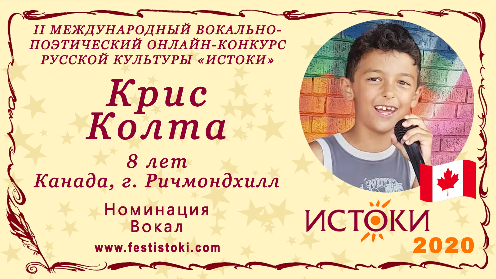 Участник II Международного вокально-поэтического онлайн-конкурса русской культуры «Истоки». Номинация - Вокал. Песня "Лучший город земли" Авторы Л.Дербенев, А.Бабаджанян. Сайт: www.festistoki.ru / www.festistoki.com E-mail: festistoki@mail.ru