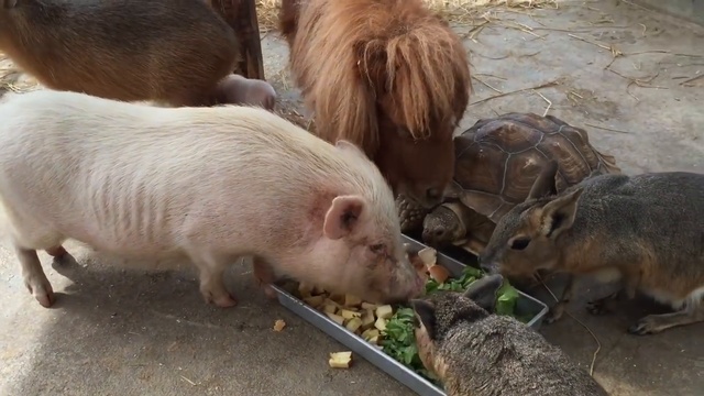 Множество животных кушают из одной кормушки.