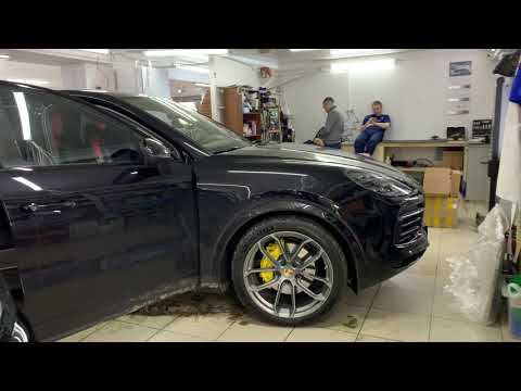 Перетяжка алькантарой потолка, шторок, козырьков и стоек Porsche Cayenne, покраска суппортов