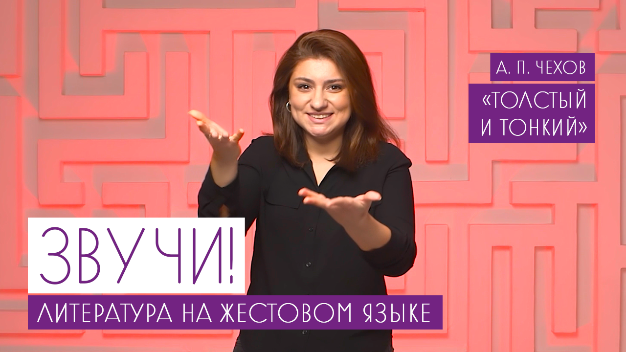 Проект "Звучи!" Литература на жестовом языке "Толстый и тонкий, А. П. Чехов". "Звучи!" – образовательный проект дистанционного обучения, в котором русская литература переведена на язык жестов профессиональными глухими и слабослышащими актерами. Язык жестов считается официальным вторым языком для людей с проблемами слуха, однако в школах для глухих и слабослышащих литературу преподают исключительно в формате чтения с листа – на уроках дети не читают по памяти стихотворения и не цитируют прозу на том языке, на котором они привыкли думать и общаться между собой – на языке жестов. Но читать стихотворение и позволить ему "прозвучать" на языке жестов – совершенно разные по эмоциональному накалу – переживания. Проект призван помочь дошкольникам, учащимся и взрослым – усвоить школьную программу по литературе по-новому.