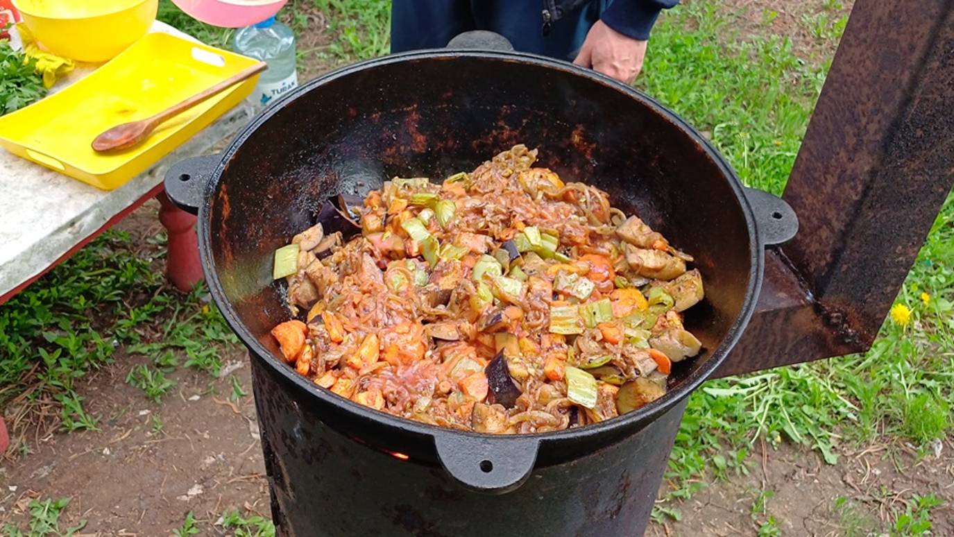 Всем привет! Вот и отдых долгожданный! Готовим в саду, на огне! Очень вкусно! Пальчики оближете - 100%. На природе это блюдо съедается за пять минут. Всем желаю прекрасного отдыха!!! Подписывайтесь на мой канал! Я рада всем! Благодарю всех за подписки и лайки! Ингредиенты: Ребрышки свиные - 1 кг Картофель - 1,5 кг Баклажаны - 1 кг Перец болгарский - 0,5 кг Лук - 0,5 кг Морковь - 0,3 кг Томат - 2 стол. ложки Аджика - 2 стол. ложки Масло сливочное - 250 гр Масло растительное - 0,2 мл Соль, перец по вкусу Зелёный лук, укроп, петрушка