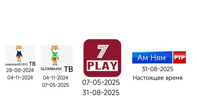 Svatoslav051015 ТВ 28 августа 2024 Glomba454 ТВ 4 ноября 2024 7 PLAY 7 мая 2025 Ам Ням РТР 31 августа 2025