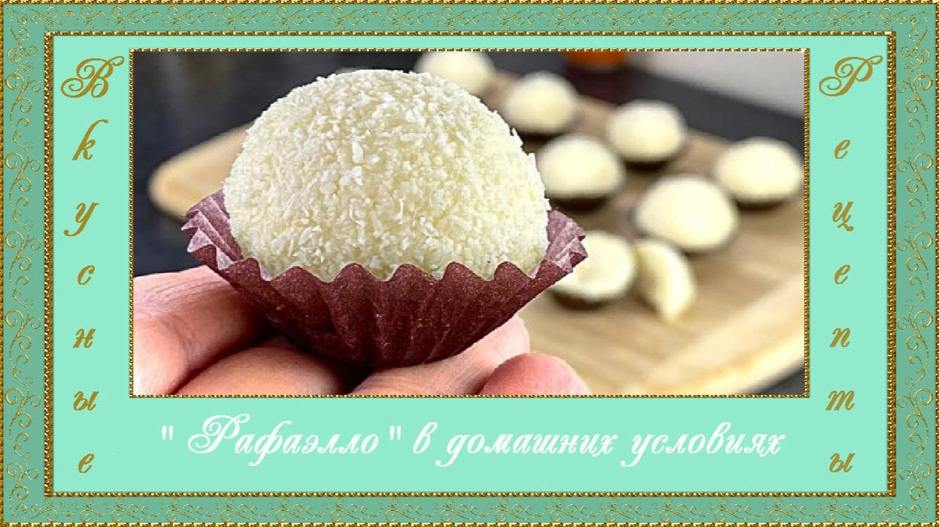 В этом видео автор, Линда ("Фантастические рецепты"), показывает видео-рецепт по приготовлению всеми любимых конфеток "Рафаэлло" в домашних условиях и без выпечки. Рецепт приготовления и ингредиенты: 160 г (1+1/2 стакана) кокосовой стружки. 260 г (2 стакана) белого шоколада без сахара (на основе подсластителя). Растопите на водяной бане. Смешайте. Накройте пленкой. Поставьте в холодильник на 10 минут. 30 г миндаля. Положите орехи в кипящую воду. Варите 3-4 минуты. Слейте воду. Очистите миндаль. Обжарьте орехи на сковороде. Приготовьте 40 г (1/2 стакана) кокосовой стружки. Сформируйте шарики. Положите миндаль в центр шарика. Обваляйте в кокосовой стружке. Поставьте в холодильник на 15 минут. Пока конфеты застывают, давайте приготовим витаминный чай! Цедра 1 апельсина. 1 столовая ложка витаминизированного или зеленого чая. 1 литр кипятка. Заварите 4-5 минут. Добавьте апельсиновый сок. Используйте бумажные формы для конфет! Приятного аппетита! Делюсь нужной, полезной и интересной информацией. Ссылка на мой дзен: dzen.ru/id/62577077be0c4d62fab577d6 Ссылка на мой телеграм: https://t.me/kira_lav_15 Я на Boosty: Boosty.to/kira_lav Если Вам не трудно: подпишитесь на меня! (Подписка без оплаты) Буду всем очень признательна! Рукоделие с Kira Lav Ссылка на автора: https://www.youtube.com/watch?v=FHemyAf4vTA&t=62s
