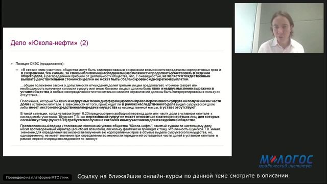 Авторская видеолекция Ивана Чупрунова «Новейшая практика ВС РФ по ограничениям на переход доли в ООО к супругу» На этой лекции разбирается новая практика ВС РФ по спорам о переходе доли участия в уставном капитале ООО к супруге. Программа: 1. Как в уставе может быть ограничен переход доли к супругу; 2. Каковы последствия включения в устав соответствующих ограничений; 3. Какими правами обладает супруг при наличии таких ограничений. Лектор: Иван Чупрунов — к.ю.н., доцент кафедры корпоративного права РШЧП (https://m-logos.ru/lecturers/chuprunov-ivan-sergeevich/ ) *** Эту лекцию можно посмотреть на сайте Института: https://m-logos.ru/product/m-lawbooksavtorskaya-videolekcziya-ivana-chuprunova-novejshaya-praktika-vs-rf-po-ogranicheniyam-na-perehod-doli-v-ooo-k-suprugu-2/ *** Более подробно данные вопросы рассматриваются в рамках онлайн-курса повышения квалификации Юридического института «М-Логос»: ✅ Корпоративное право: проблемные вопросы законодательства, корпоративные споры и сопровождение корпоративных процедур 30.10.25 - 23.01.26 (74 ак.ч.) https://m-logos.ru/onlain_seminars/onlajn-programma-povysheniya-kvalifikaczii-korporativnoe-pravo-3/152825_30102025_23012026/ ✅ Ответственность директоров и иных контролирующих общество лиц 11.03.26 - 17.04.26 https://m-logos.ru/onlain_seminars/onlajn-programma-povysheniya-kvalifikaczii-otvetstvennost-direktorov-i-inyh-kontroliruyushhih-obshhestvo-licz/164876_11032026_17042026/ ✅ Корпоративное право: проблемные вопросы законодательства, корпоративные споры и сопровождение корпоративных процедур 02.04.26 - 03.07.26 https://m-logos.ru/onlain_seminars/onlajn-programma-povysheniya-kvalifikaczii-korporativnoe-pravo-3/164550_02042026_03072026/ *** Все мероприятия Института по данному направлению смотрите здесь https://m-logos.ru/direction/corporate/ 📚 Расписание всех курсов повышения квалификации юристов смотрите на сайте https://m-logos.ru/onlain_seminars/ 🎬 Рекомендуем другие бесплатные лекции (раздел регулярно обновляется) https://m-logos.ru/online_lectures *** Анонсы предстоящих бесплатных лекций публикуются в социальных сетях Института: ВКонтакте https://vk.com/m_logos Телеграм-канал https://t.me/m_logos