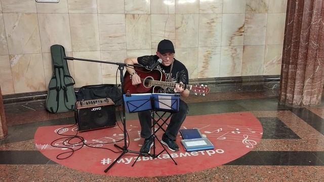 Уличный музыкант из Архангельска исполняет песни под гитару в метро Москвы.