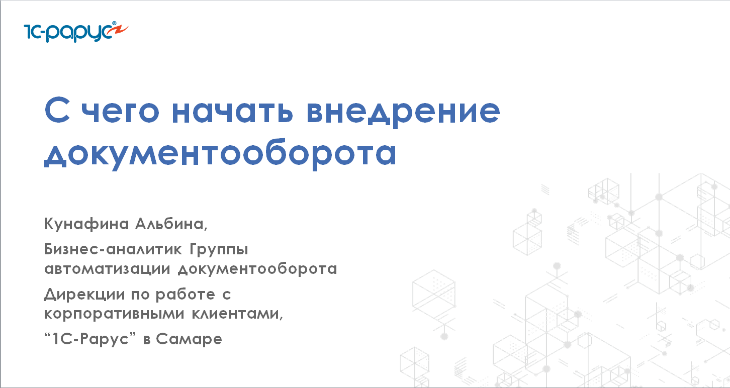 Запись вебинара от 14 июня 2023 года на тему "С чего начать внедрение 1С:Документооборот". Программа вебинара: Законодательные требования и ответственность. Требования к хранению документов в ООО. Определение необходимости внедрения СЭД. Подготовка к внедрению. Проведение предпроектного обследования. Проектирование целевой модели документооборота. Реальный кейс автоматизации документооборота в ООО «СВГК». Проектирование целевой модели документооборота. Реальный кейс автоматизации документооборота в ООО «СВГК».