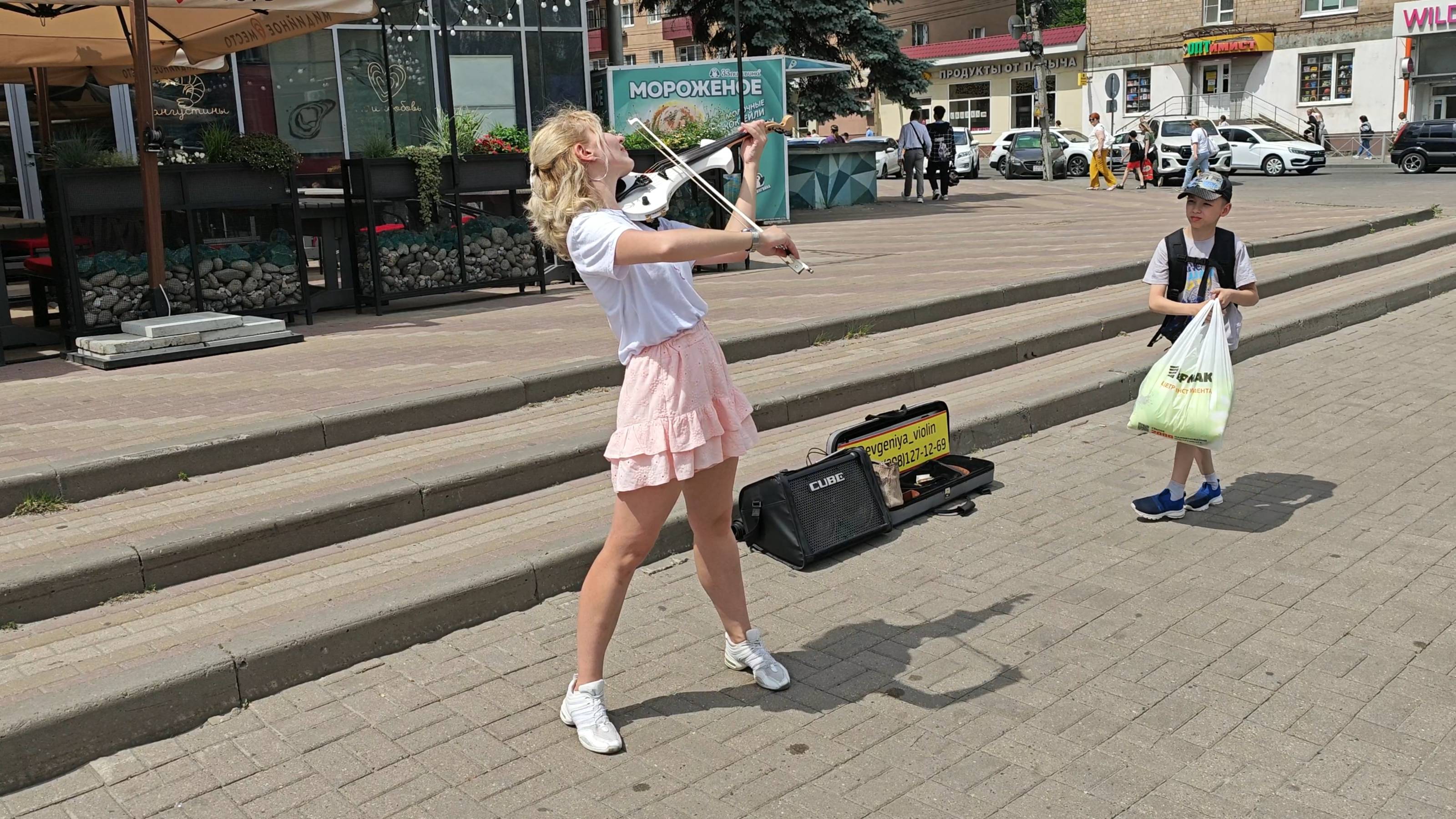 Выступление скрипачки Евгении Мальцевой 3 июня 2025 г. у street food - кафе "Мидийное место" в г. Курске на ул. Ленина, 60А. Часть концерта.