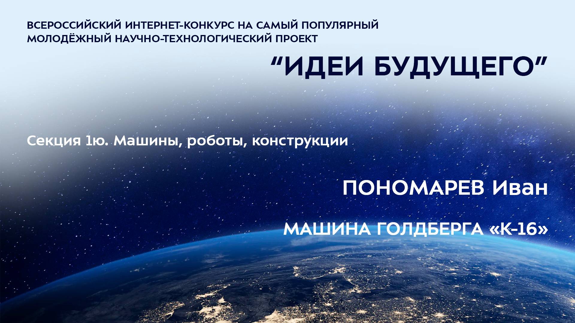 (1Ю-12) ПОНОМАРЕВ Иван Антонович Омская область, г. Омск БОУ ДО г. Омска «ГДДюТ», 5 класс МАШИНА ГОЛДБЕРГА «К-16» Научный руководитель: Пономарева Маргарита Михайловна, Омская область, г. Омск, БОУ ДО г. Омска «ГДДюТ», старший педагог дополнительного образования Более подробно о мероприятиях Программы "Шаг в будущее" можно узнать на сайтах http://www.step-into-the-future.ru/ и http://шагвбудущее.рф