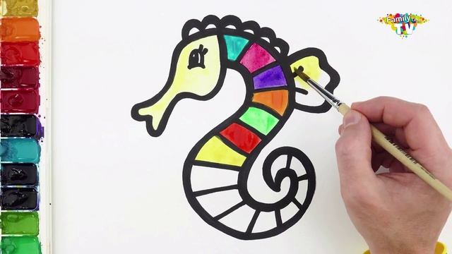 Как нарисовать и раскрасить морского конька. Морские животные. Картина гуашью.
