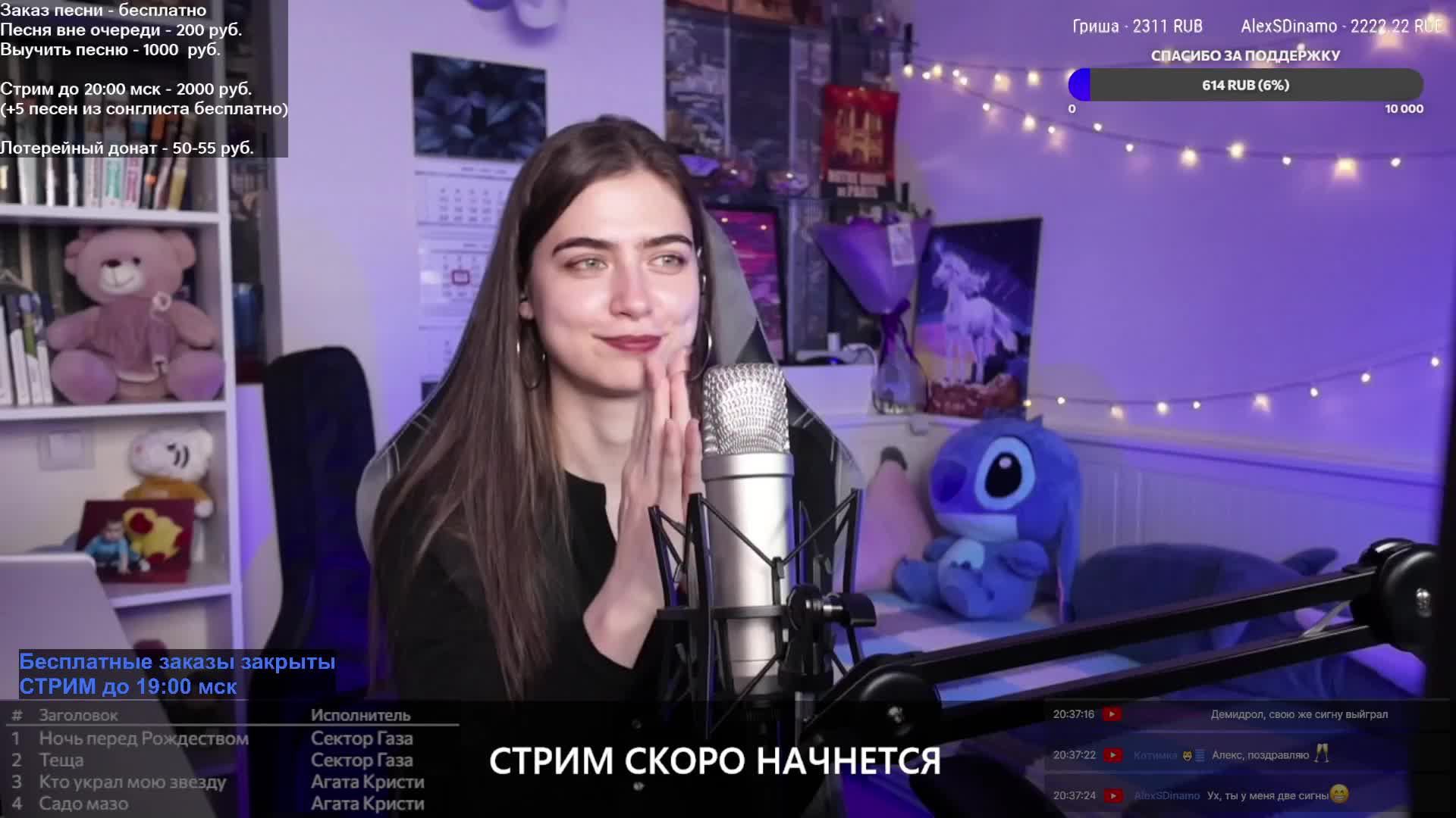 СОНГЛИСТ: https://www.streamersonglist.com/t/pleur10/songs Здесь можно ПОДДЕРЖАТЬ МЕНЯ: https://www.donationalerts.com/r/pleur Сбер: 2202208146331732 РАСЦЕНКИ актуальны до 19:00 мск. (После смотреть в левом верхнем углу экрана): Песня в порядке очереди - бесплатно Песня вне очереди - 200 руб. Сигна - 250 руб. Выучить песню вне очереди - 1000 руб. (Учу песню, если она мне понравится. Если нет, можно будет поменять на другую. Учу 1-2 недели) Продлить стрим до 20:00 мск - 2000 руб. (Изначально стрим до 19:00 мск) Лотерейный донат - 50-55 руб. (У меня загадано число от 50 до 55. Вы кидаете донат с суммой в этом диапазоне и указываете песню. Если сумма в донате будет соответствовать загаданному числу, я спою вашу песню вне очереди). TELEGRAM: https://t.me/+4NrzIaaI0mgwNTVi Там будет вся информация о стримах и ваши сигны🥰 --------------------------------------------------------------------------------------------— АППАРАТУРА: Микрофон: Rode NT1-A Наушники: FiiO FH5s Звуковая карта: Steinberg UR22C Камера: DJI Osmo Pocket 3 Гитара: Solista SG-D1 Black Пианино: Solista DP-200 --------------------------------------------------------------------------------------------— РАСПИСАНИЕ СТРИМОВ: вт, чт, вс/пн 16:00 МСК ---------------------------------------------------------------------------------------------— Twitch: https://twitch.tv/pleur10 YouTube: https://www.youtube.com/@pleur10 VK: https://vk.com/pleur10 VK Play Live: https://live.vkplay.ru/pleur10