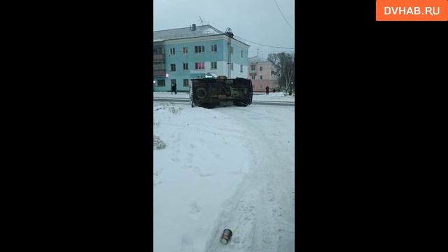 В Николаевске-на-Амуре на улице Луначарского произошло одиночное ДТП с участием автомобиля скорой помощи марки УАЗ. Водитель машины скорой помощи резко затормозил во избежание столкновения, не справился с управлением и автомобиль опрокинулся.