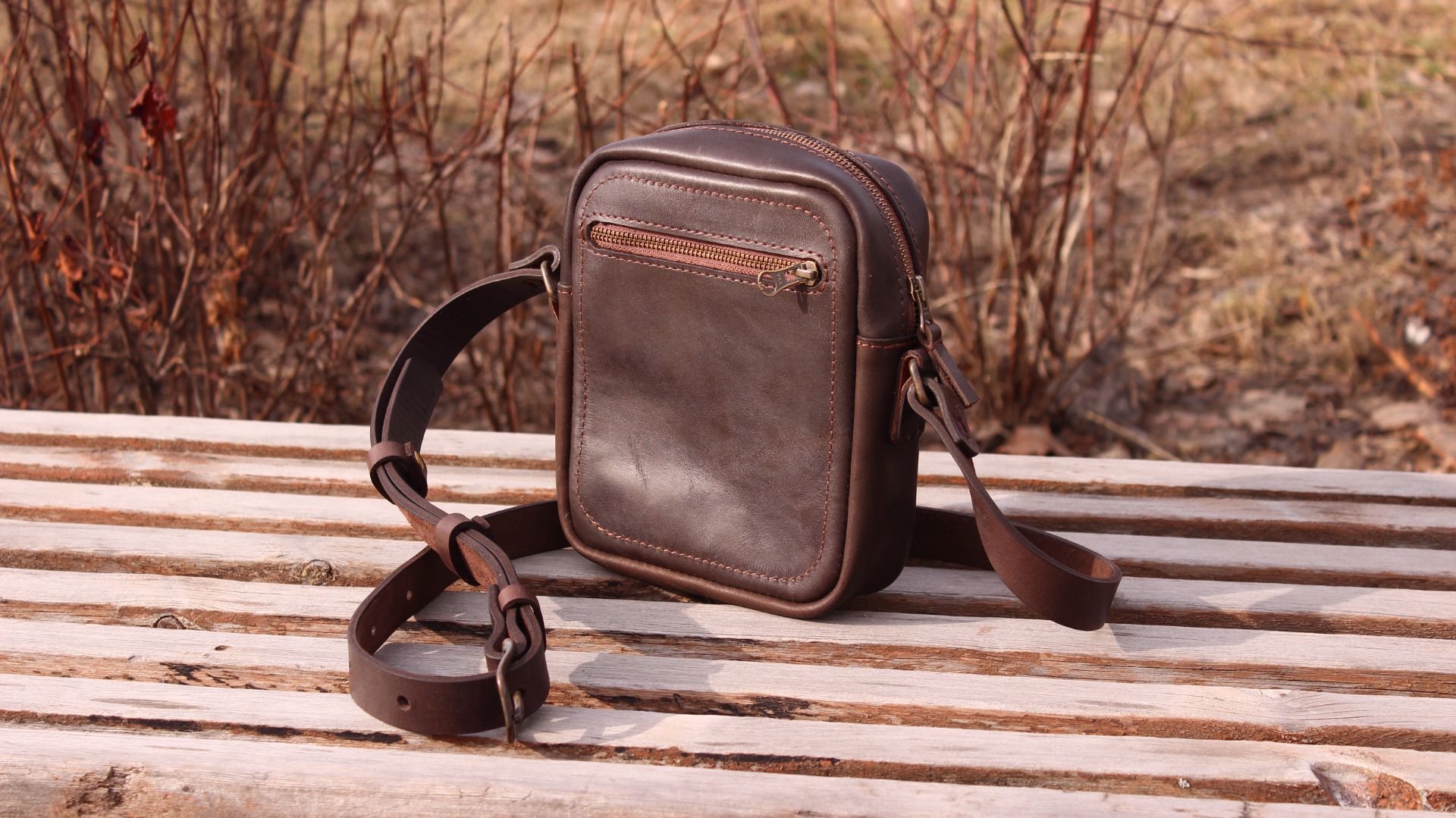 Сумка сделана из остатков шорно седельной кожи. Толщина кожи 2,2 мм. В сумке 2 кармана, один снаружи на молнии, а второй карман внутри сумки просто накладной. Размеры сумки наружные 21*18*7,5 см. Так как сумка сделана из остатков кожи т.е. не первый сорт могу сказать что на коже естественно присутствуют мелкие царапины, помятые места и лохматая бахтарма (обратная сторона кожи) Но в целом сумка выглядит очень винтажно. Фурнитура из латуни, молнии ykk.