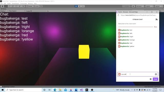 I saw some Twitch chat games on twitch and thought it would be pretty fun to use Twitch's api to make a simple cube move around and light up. I'll probably test it on stream one day. Stephen Barr tutorial: https://www.youtube.com/watch?v=v8yhy-5ntHM My games: https://bugbakergames.itch.io/