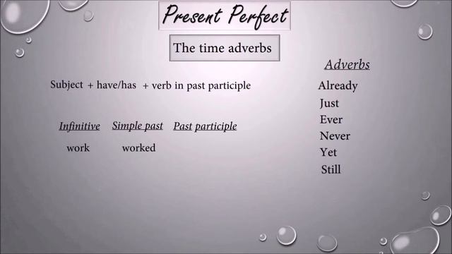 An easy introduction to Present Perfect and the time adverbs for it.