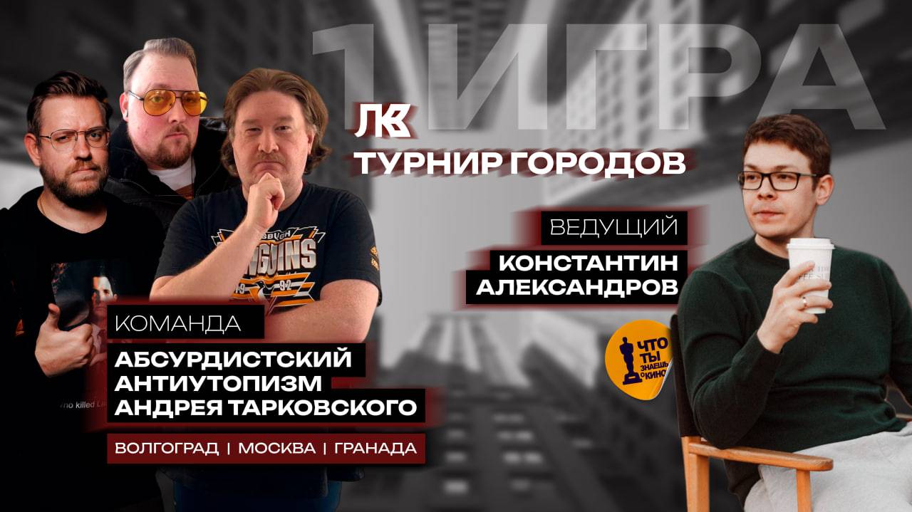 Турнир городов — командное состязание в формате квиза. Это серия игр, которая поделена по сезонам: осенняя, зимняя, весенняя и летняя. Игры проходят раз в две недели, регистрация команд через нашу группу в ТГ: https://t.me/QuizKinoSecret В первом выпуске принимает участие лучшая команда Осенней Серии - "Абсурдисткий антиутопизм Андрея Тарковского" (Волгоград, Москва, Гранада) в составе: Василия Кучерука, Ильи Доленко и Тимура Бокова!