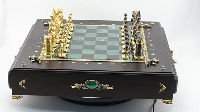 •Шахматный ларец изготовлен из дерева с элементами декора из бронзы и малахита. Ящики для фигур внутри обтянуты бархатом. Размер ларца 440*480*100мм. •Упаковано в деревянный кейс обтянутый искусственной кожей, размер 560*520*120мм. •Фигуры изготовлены из бронзы, доска из камня змеевик и габбра-диобаз. •Размер игрового поля 280*280мм, размер клетки 35*35мм, размер пешки 24*24*51мм, размер короля 32*36*87мм. •Вес с упаковкой 17кг. •Рисунок и цвет камня уникален, поэтому может незначительно отличаться от экземпляра представленного на фотографии. Цена: 111 400 руб. https://radugakamnya.ru/catalog/suveniry_iz_kamnya/suveniry_iz_zmeevika_i_krenoida/shakhmaty_i_nardy_iz_zmeevika/shakhmatnyy_larets_kamelot_440_450_187mm-621845/