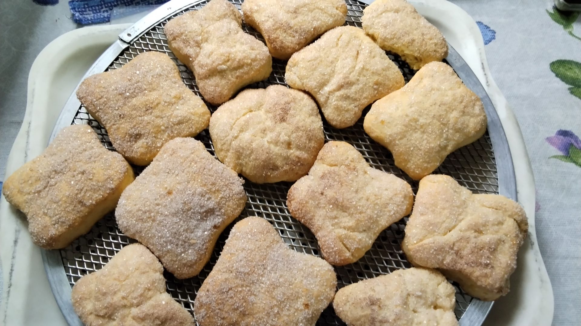 Печенье на кефире. Смешать1 яйцо, щепотку соли,80,0 сахар, 80 грамм кефир,80 грамм подсолнечное масло, добавить цедру, ванильный сахар , 400,0 частями муку с 2 ч.л разрыхлителя, недолго замесить, накрыть , дать отдохнуть 10 минут, раскатать 0,5 см. Разрезать, окунуть одной стороной в сахар с корицей. Выпечка 25 мин при 180 градусах