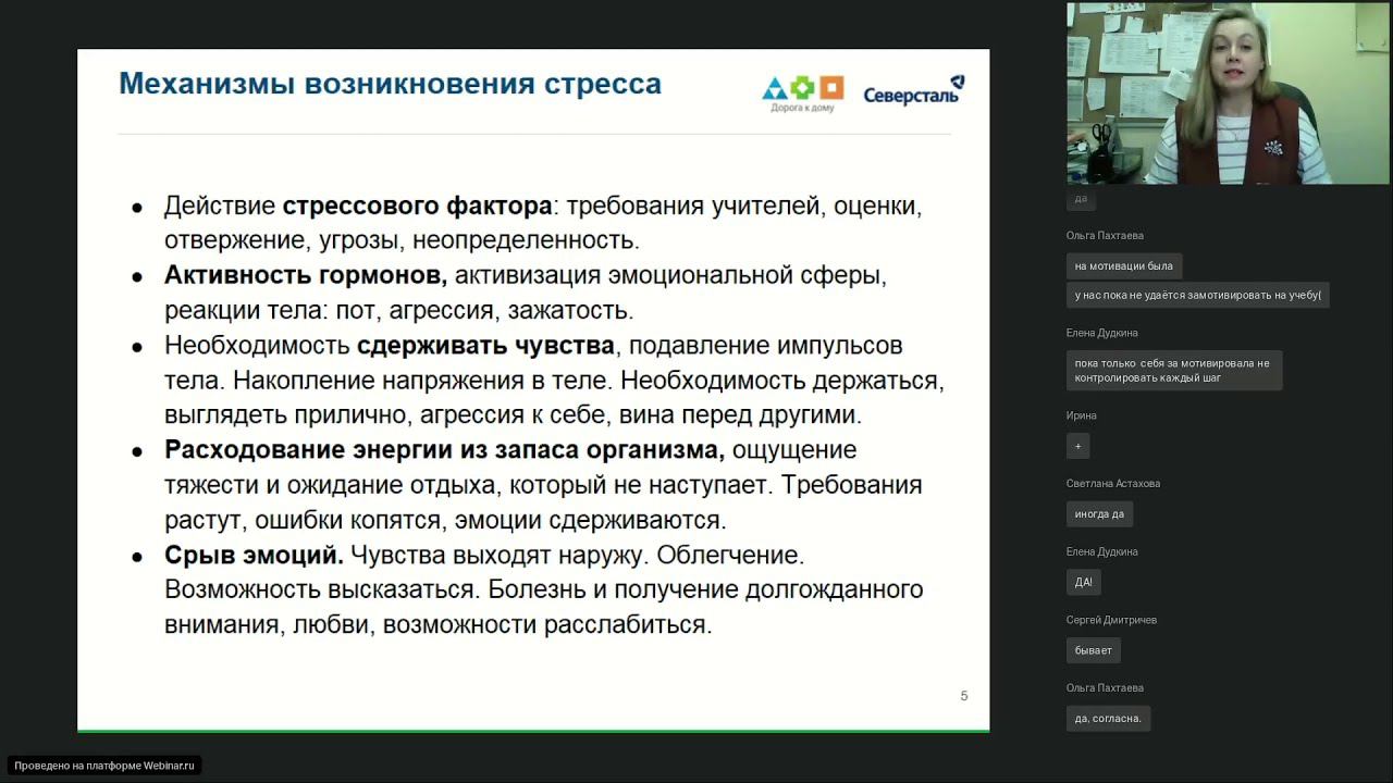 Онлайн-занятие с участием психолога службы «Подросток» БФ «Дорога к дому» Елены Ливенцевой. Что вы узнаете 1. Как возникает стресс и в чем причины отказа детей от учёбы 2. Воспитание стрессоустойчивости: 3 важные привычки 3. Алгоритмы решения ситуаций: Ситуация 1. Ненавистная домашка: ребенок не записывает, не знает, что задано, делает не то, не делает вообще или списывает Ситуация 2. Ребенок не видит смысла в учебе, двойка не волнует, на замечания не реагирует, учиться не нужно, важны деньги и взрослость Ситуация 3. Конфликты с учителем. Мероприятие соcтоялось в рамках проекта «Родительское просвещение» БФ «Дорога к дому» компании «Северсталь».