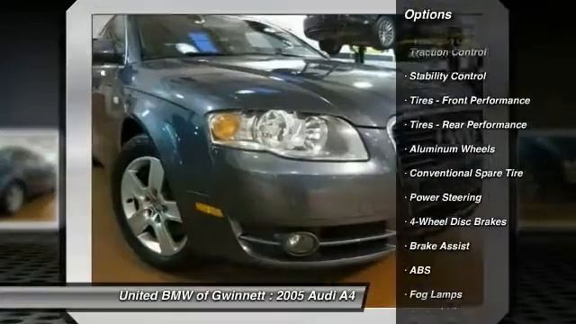2005 Audi A4 2.0T - $7880 http://www.gwinnettbmw.com For more information on this vehicle and our full inventory, call us at (770) 476-8800 United BMW of Gwinnett 3264 Commerce Avenue Duluth GA 30069 This 2005 Audi 2.0T A4 Sedan has a Quartz Gray Metallic exterior with Platinum Leather interior! Options include an Automatic Transmission, Heated Front Seats, Dual Zone a/c controls, Steering Wheel with Controls, and a Moonroof. CARFAX 1-Owner! This A4 is priced $2,200 below NADA Retail. CENTER OF EXCELLENCEBMW of North America has awarded United BMW with it's third consecutive Center of Excellence Award for 2013! United BMW is the only BMW dealership in Georgia to win this prestigious award! The Center of Excellence Award is reserved for dealers who distinguish their operation through exceptional performance, brand representation, and outstanding customer experience. This year, only 33 out of 339 BMW dealers nationwide were awarded the 2013 Center of Excellence! WHY BUY FROM US?United BMW of Gwinnett is proud to offer the Southeast's largest inventory of Certified/Pre-Owned BMW's, and proud to be the #1 volume Pre-Owned/Certified BMW dealer in the Nation as well as the largest retailer in Penske Automotive Group. CONTACT USPlease Email Us or Call our Internet Department Directly at 888-246-5034 to Schedule Your Test Drive Today! Pricing analysis performed on 2/7/2014. - This 2005 Audi A4 4dr 2005.5 4dr Sdn 2.0T CVT Sedan features a 2.0L 4 CYLINDER 4cyl Gasoline engine. It is equipped with a 6 Speed Automatic transmission. The vehicle is Quartz Gray Metallic with a Platinum interior. - Air Conditioning, Cruise Control, Power Steering, Power Windows, Power Door Locks, Passenger Airbag, ABS Brakes, AM/FM, Leather - Contact Pre-Owned Internet Sales Department at 770-476-8800 or tpoff@penskeautomotive.com for more information. -
