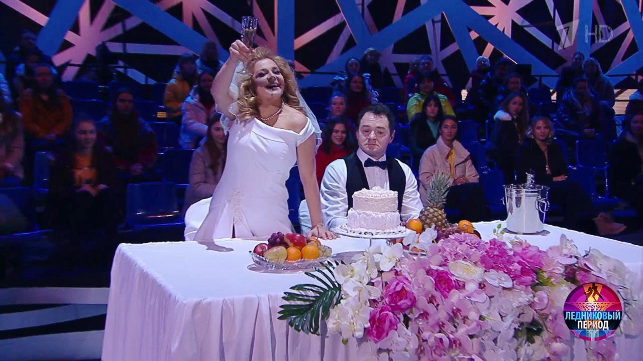 На льду – актриса Ирина Пегова и олимпийский чемпион Алексей Тихонов. Они танцуют под песню Билли Айлиш «Bad Guy» в исполнении коллектива «Postmodern Jukebox» и Арианы Савалас.