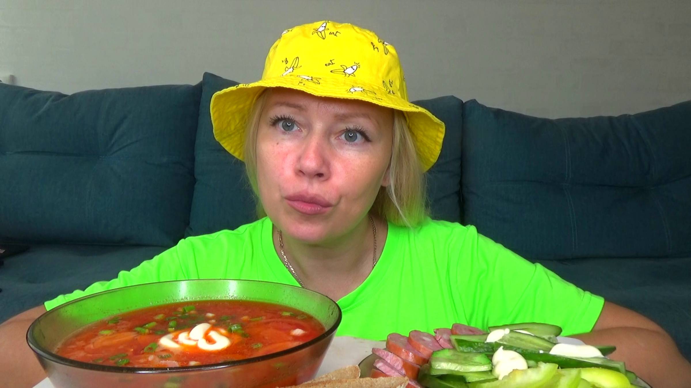 Мукбанг борщ наивкуснейший, овощи, колбаса. Еда на камеру.