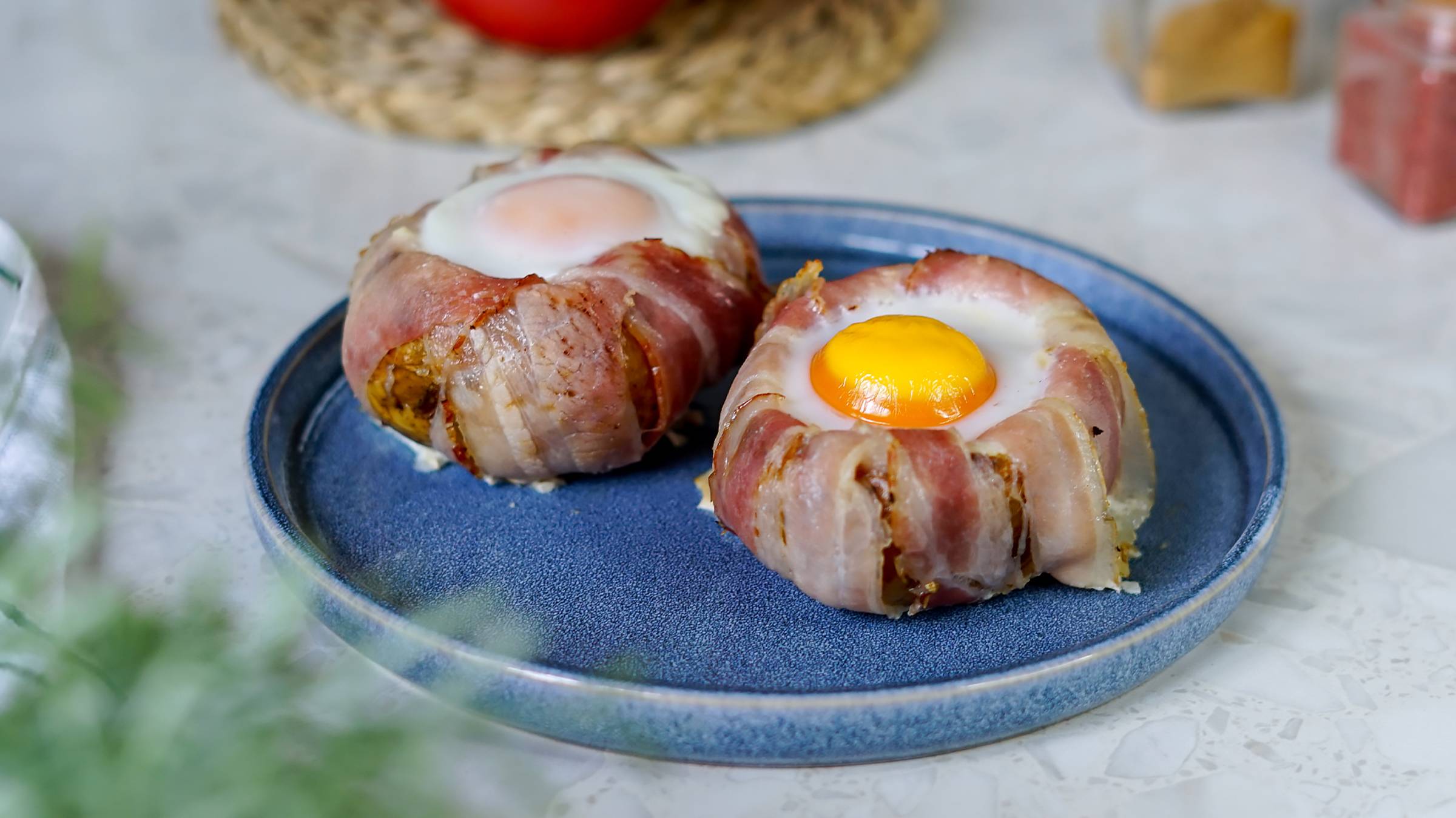 Ингредиенты: картофель - 2 шт сыр - 100 г бекон - 6 слайсов яйцо - 2 шт соль - 1/2 ч.л перец черный молотый растительное масло Картофель вымойте и просушите бумажным полотенцем. Каждый клубень проколите ножом несколько раз и смажьте картофель растительным маслом. Запекайте 1 час в разогретой до 180 градусов духовке. Затем остудите картофель. Срежьте верхушки, ложкой выньте почти всю мякоть и выложите её в миску. К мякоти добавьте сыр, соль и перец. Перемешайте. На рабочую поверхность выложите по три слайса бекона и заверните в него картофель. Наполните картошку начинкой и аккуратно добавьте яйцо. Запекайте 15 минут в разогретой до 180 градусов духовке. Приятного аппетита!