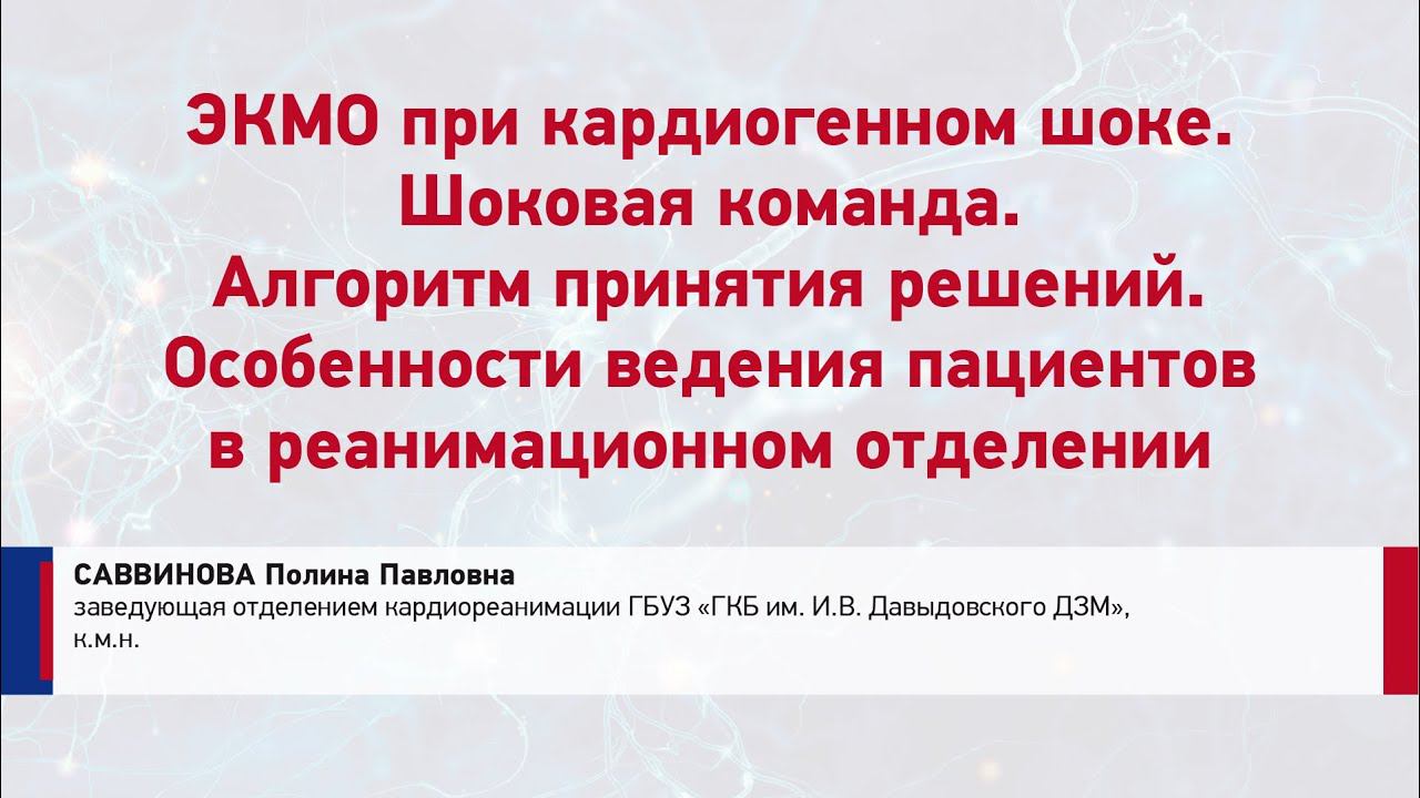27.05.2022 Московский курс по сосудистой патологии "Шоковые центры для лечения пациентов с ОКС" "ЭКМО при кардиогенном шоке. Шоковая команда. Алгоритм принятия решений. Особенности ведения пациентов в реанимационном отделении" Саввинова Полина Павловна заведующая отделением кардиореанимации ГКБ им. И.В. Давыдовского ДЗМ, к.м.н.