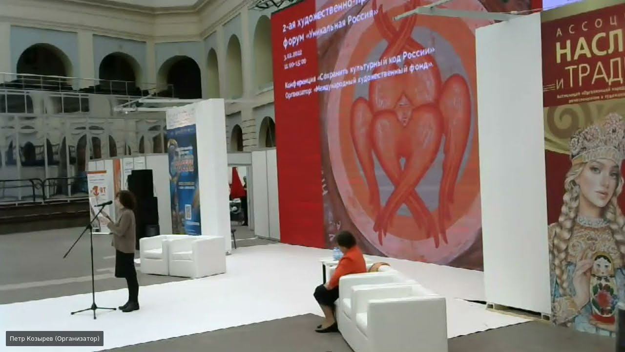 03.02.2022 В рамках 2-ой Художественно-промышленной выставки-форума «УНИКАЛЬНАЯ РОССИЯ» прошла конференция: "Сохранить культурный код России", на которой были рассмотрены вопросы развития в России современного общества, проблемы сохранения и развития искусства, образования, национальных традиций. Организатор: Международный художественный фонд Доклады 1. МЕЛЬНИКОВ В.Л. Кандидат культурологии, генеральный директор Презентация 1 тома Энциклопедии «Наследие Н.К.Рериха» Центр культурных и научных проектов «АРС», Санкт-Петербург 2. КРЫЛОВ А.К. заслуженный художник РФ, академик РАХ Сохранение православных памятников на территории Северо-Запада России Российская академия художеств, Санкт-Петербург 3. ДУБРОВСКАЯ Н.П. директор Практика сохранения культурного наследия России на примере Музея-заповедника «Изборск» Музей-заповедник «Изборск», Псковская область 4. ТООТС Н.А. Главный редактор Проблемы в культуре и образовании в условиях глобализации Журнал «Дельфис» Москва 6. ВЛАСОВ Д.В. художник Инновационные музейные проекты. Международный художественный фонд ,Москва 7. КРЫЛОВ В.Л. Заслуженный художник РФ Антикультура и выживание России. Международный художественный фонд, Москва 8. ЖИГОТА В.Э. Культуролог Проект создания культурно-просветительского центра нового поколения Национальный Рериховский комитет 9. КОЗИН НИКОЛАЙ Директор Возрождение народных промыслов. Дом мореного дуба ТСХ ДПИ Республика Марий Эл 10. АВЕРЬЯНОВА АНАСТАСИЯ Русский костюм. Вопросы сохранения и дальнейшего развития ТСХ ДПИ, Москва
