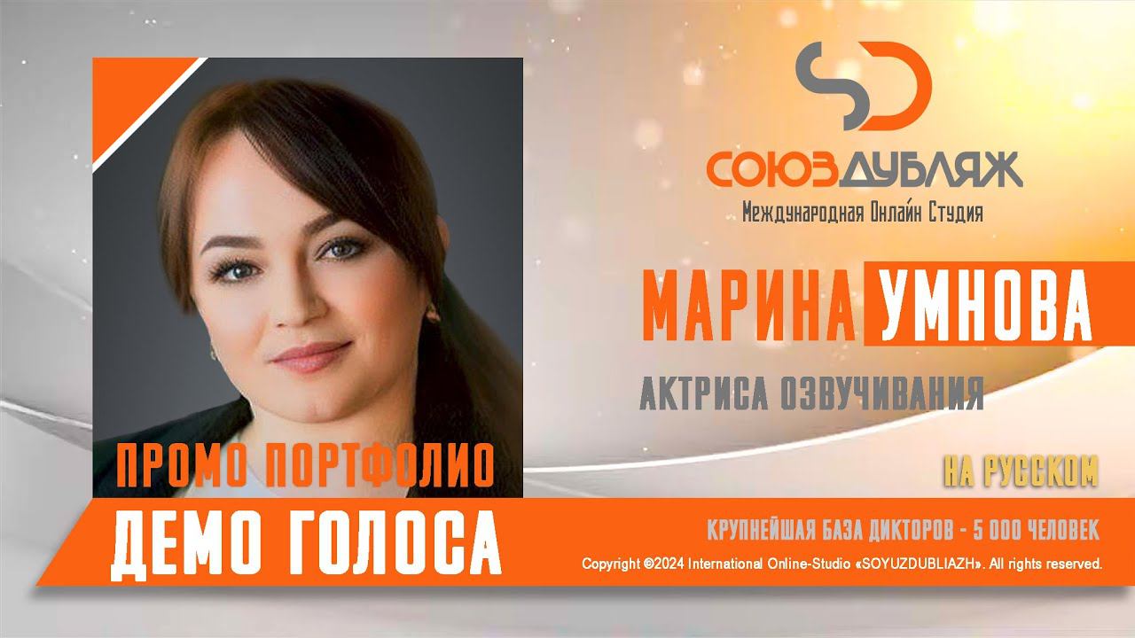 #СоюзДубляж #БазаДикторов #Озвучка ✔️Марина Умнова, актриса озвучивания. Международная Онлайн-Студия "СОЮЗДУБЛЯЖ" - профессиональная озвучка и дубляж. ▪️Рабочая группа в Телеграм: https://t.me/soyuzdubliazh ▪️Контакт для связи: https://t.me/SoyuzAdmin ▪️Подпишись:https://www.youtube.com/c/SOYUZDUBLIAZH ▪️Сайт: https://www.soyuzdubliazh.com/ Лучшие голоса для вашей аудиорекламы и видеороликов. База дикторов - 5 000 человек, профессионального уровня на ENG| FR| TR| RU| ISR| AZ| UA| KZ| UZ| языках. Мужские и Женские топовые голоса для озвучки любых проектов, таких как: Рекламы, Презентации, Фильмы, Сериалы, Игры, Мультфильмы, ТВ Шоу, Аудио-видео визитки. ✔️Сотрудничая с нами вы получаете свой проект под ключ, не выходя из дома или офиса. Наша слаженная команда из лучших дикторов, актёров озвучивания, режиссёров и звукорежиссёров в кратчайшие сроки озвучат или отдублируют ваш заказ на профессиональном уровне. Образцы работ нашего портфолио вы сможете посмотреть на канале СОЮЗДУБЛЯЖ. ВНИМАНИЕ: ✔️Мы приглашаем специалистов озвучки к сотрудничеству в нашей команде. Вы можете пройти по ссылке в наш телеграм канал и связаться с Админом для обсуждения. ✔️Всем заказчикам подобных медиа проектов по озвучки и дубляжу фильмов, сериалов, документалок обращаться непосредственно к Админу Телеграм группы СОЮЗДУБЛЯЖ, пройдя по ссылке: Проходи по ссылке: https://t.me/soyuzdubliazh International Online-Studio SOYUZDUDLIAZH presents a highly professional approach in voice-over and dubbing. ▪️Our working group https://t.me/soyuzdubliazh ▪️Chief manager https://t.me/SoyuzAdmin ▪️Follow https://www.youtube.com/c/SOYUZDUDLIAZH ▪️Web: https://www.soyuzdubliazh.com/ We offer You the best Voices for your Audio commercials and Video`s. Our Database contains over 5 000 voices of native speakers and high-class foreign language specialists in ENG| FR| TR| RU| ISR| AZ| UA| KZ| UZ|. Male & Female top level voices for all the variety of dubbing projects such as commercials, presentations, movies, TV-series, video and computer games, cartoons, TV-shows, audio & video portfolio’s – all in one place. As your business partner we guarantee a turn-key project without you leaving your house or office. Our target is to make sure that the dubbing of your project is made as quick as possible by a well-coordinated and professional team of the best speakers, film and sound directors. To whom it may concern! We invite dubbing specialists to join our team. Please contact our manager on Telegram https://t.me/soyuzdubliazh