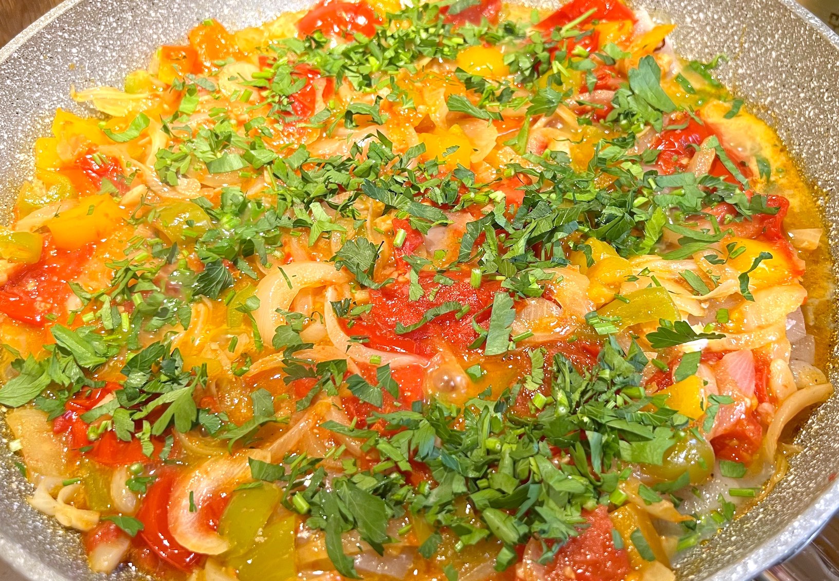 Филе минтая ... посолить, поперчить и сбрызнуть соком лимона ... мелко порезанный чеснок и острый перец обжарить на сковородке ... добавить лук кольцами ... болгарский перец и помидоры ... обжарить, долить немного воды и тушить 10 минут ... отодвинуть массу ... на дно сковородки сложить минтай ... прикрыть содержимым и тушить 5-7 минут ... украсить зеленью и бокалом белого сухого! Приятного аппетита!