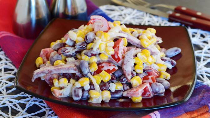 Быстрый в приготовлении салат с колбасой, консервированной фасолью и кукурузой, свежими помидорами. Этот салат - палочка-выручалочка, когда неожиданно нагрянут гости! #СалатСКолбасой #СалатСПомидорами #СалатСКолбасой #СалатСКукурузой