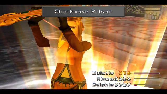 ファイナルファンタジーVIII-レベル8クイスティスvsオメガウェポン You can delay Omega Weapon turns by throwing it potions. Make sure you have a character with enough speed to be able to throw a potion to Omega Weapon before it get its turn, you can repeat it over and over again while the other character simply attack. In my case Shephie had Spd 87 (Triple junctioned), Auto-Haste and Initiative. You need to have atleast more than 61 speed since Omega Weapon has that speed. Note: Works in ANY version of the game. With 11.2% HP or less and using Aura your character will reach Crisis Level 4 100% of the time. Quistis' Blue Magic powers up depending on what her Crisis Level is. All her skills which inflict normal damage and their Power values: Attack | CL1 | CL2 | CL3 | CL4 | Element | Target(s) ----------------------|-------|--------|---------|-------|----------------|---------- Laser Eye | 40 | 48 | 58 | 64 | - | one Ultra Waves | 27 | 33 | 40 | 48 | - | all Electrocute | 30 | 36 | 44 | 50 | Lighting | all Aqua Breath | 50 | 70 | 80 | 100 | Water | all Acid | 30 | 38 | 44 | 52 | - | all Gatling Gun | 60 | 80 | 100 | 120 | - | one Fire Breath | 70 | 90 | 100 | 120 | Fire | all Homing laser | 100 | 150 | 200 | 250 | - | one Ray-Bomb | 80 | 90 | 100 | 110 | - | all Shockwave Pulsar | 150 | 200 | 200 | 250 | - | all Note: If the opponent's Spirit is at 0, and Shockwave Pulsar is at its maximum magic power, it can potentially inflict up to 34.000 damage. Gatling Gun is physical, everything else is magical Acid may also inflict status effects depending on the Crisis Level: CL1: Poison CL2: Poison, Darkness CL3: Poison, Darkness, Silence, Vit0 CL4: Poison, Darkness, Silence, Vit0, Petrify Her other Blue Magics: LV? Death (all) CL1: Casts Death on enemies whose level is a multiple of 4 CL2: Casts Death on enemies whose level is a multiple of 3 CL3: Casts Death on enemies whose level is a multiple of 2 CL4: Casts Death on enemies whose level is a multiple of 1 Degenerator (one) Kills any enemy not immune to it. Micro Missle (one), gravity damage CL1: 50% HP CL2: 75% HP CL3: 87.5% HP CL4: 93.75% HP Bad Breath (all), inflicts status effects CL1: Poison, Darkness, Silence, Sleep, Slow, Confuse CL2: Poison, Darkness, Silence, Sleep, Slow, Confuse, Berserk, Stop, Slow Petrify CL3: Poison, Darkness, Silence, Sleep, Slow, Confuse, Berserk, Stop, Slow Petrify, Petrify, Zombie CL4: Poison, Darkness, Silence, Sleep, Slow, Confuse, Berserk, Stop, Slow Petrify, Petrify, Zombie, Vit0, Doom, Death White Wind (all allies), heals HP HealingAmount = QuistisMaxHP - CurrentHP Mighty Guard (all allies), inflicts status effects CL1: Protect, Shell CL2: Protect, Shell, Regen, Haste, Float CL3: Protect, Shell, Regen, Haste, Float, Aura CL4: Protect, Shell, Regen, Haste, Float, Aura Whip: Save the Queen Abilities: Auto-Haste, HP +80%, Mag +60%, Mag +40% For this battle i farmed Magic points with Devour ability (+22 Mag exactly, killing 22 Behemoths). Thanks to this and to Mag +60% and Mag +40%, Quistis reached 255 Mag. Kamikaze: The amount of damage done is equal to the character's max HP multiplied by 5, although the attack can be a critical hit. Quistis's max HP was 9541. 9541 x 5 = 47,705 (The hard damage cap is set to 60,000). In FFVIII there are 5 abilities that can break the 9,999 damage limit: - Cactuar's 1,000 Needles can deal 10,000 damage at level 100. - Boko's ChocoBocle can deal up to 16,000 at level 100. (OG version only) - Quistis Shockwave Pulsar can deal 34,000 damage with 255 Mag. - Kamikaze can deal 60,000 damage if character has max HP (9999) and if the attack is a critical. - Eden's Eternal Breath can deal 60,000 damage at level 100 with 250% boost.
