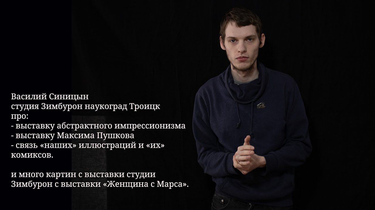 Василий Синицын о выставке абстрактного импрессионизма в Выставочном зале ТЦКТ, выставке Максима Пушкова в Троицком Доме Учёных, с обращением к директору Троицкой Детской Художественной школы Михаилу Семёнову и про связь иллюстраций и комиксов. Студия Зимбурон https://vk.com/zimburon