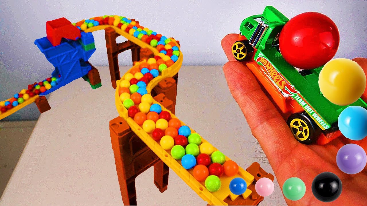Видео для детей. Катам разные игрушки машинки и шарики через трамплин. Детям