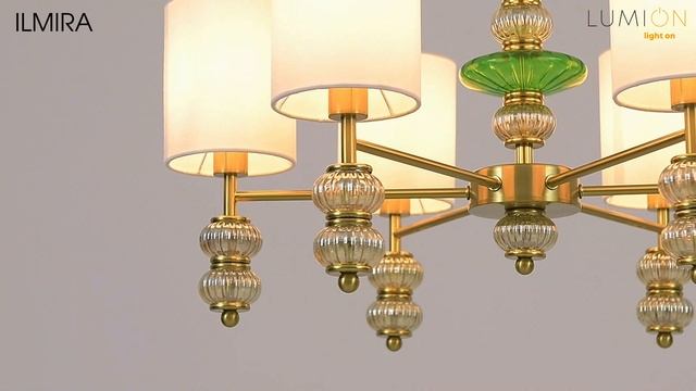 Основным декоративным элементом светильника ILMIRA являются стеклянные ребристые шарики янтарного цвета на бронзовой арматуре. Два зеленых стеклянных элемента на центральной части добавляют светильникам в бронзово-янтарном исполнении декоративности и шика. Светильники оснащены текстильными абажурами белого цвета.